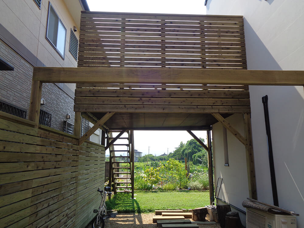 屋根付きパーゴラにプラスし、景色がとてもよいので上部をバルコニーとしても活用できるようご提案させて頂きました。