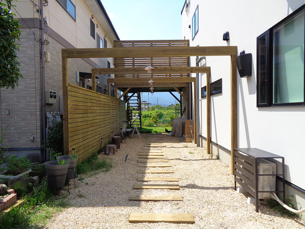 お隣との境界には高さ2mの外構フェンスを設置。倒れ防止用として門のように固定し、アプローチとして枕木を並べました。
