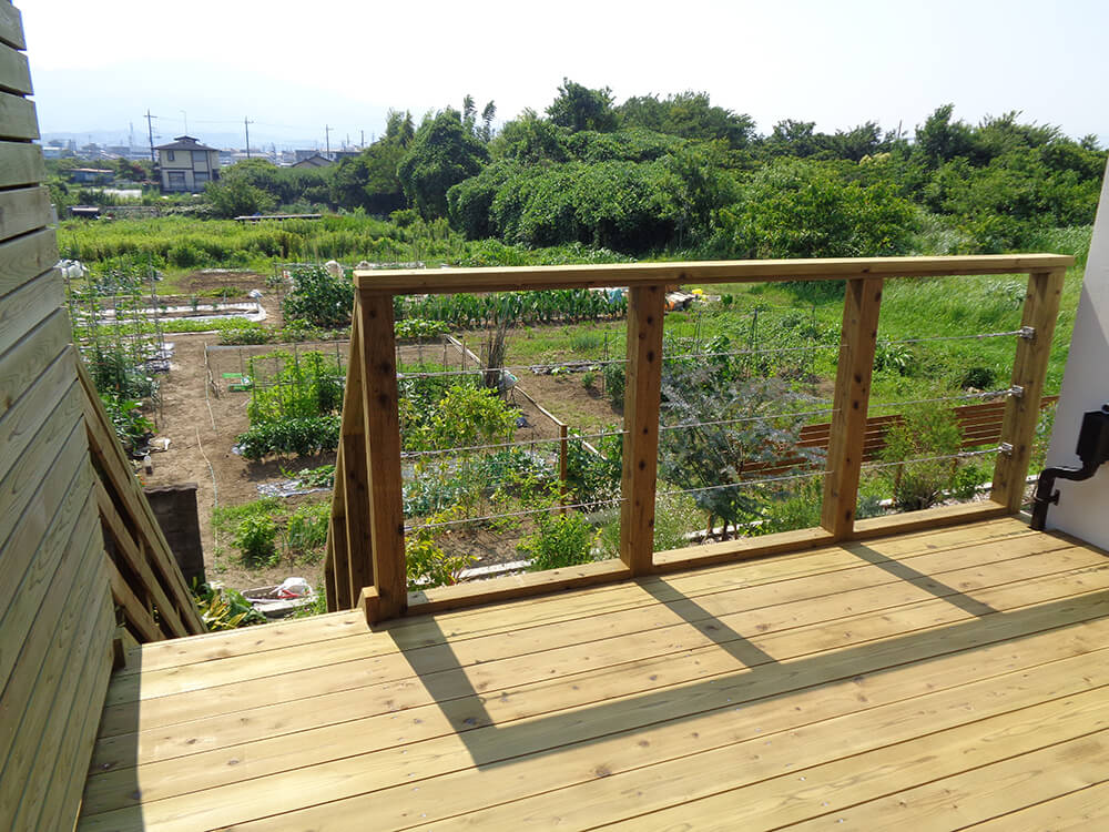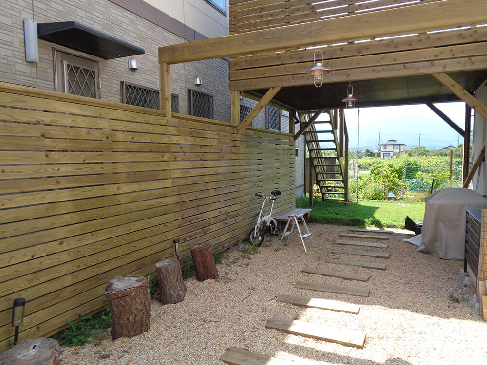 Ⅼ字に横張り目隠しフェンスを設置し、開けた正面はワイヤーフェンスで開放感を出しました。