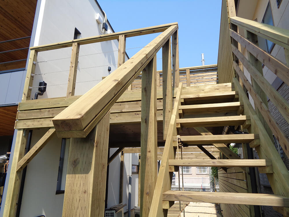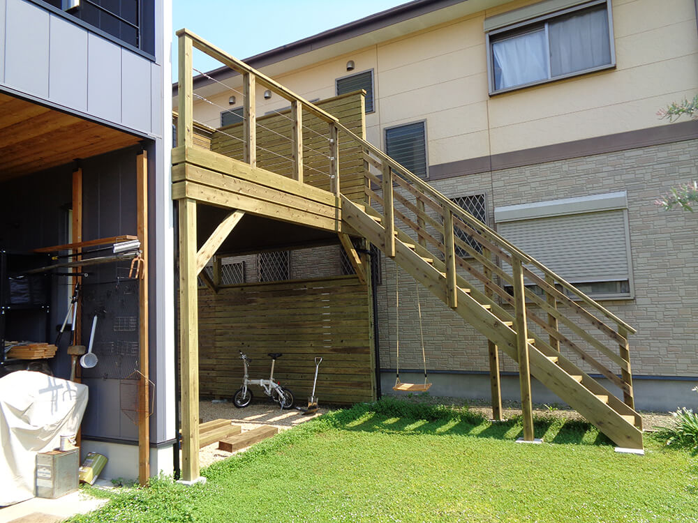 木材はすべてに国産杉ACQ加圧注入材を使用しています。階段・枕木も同じ木材です。