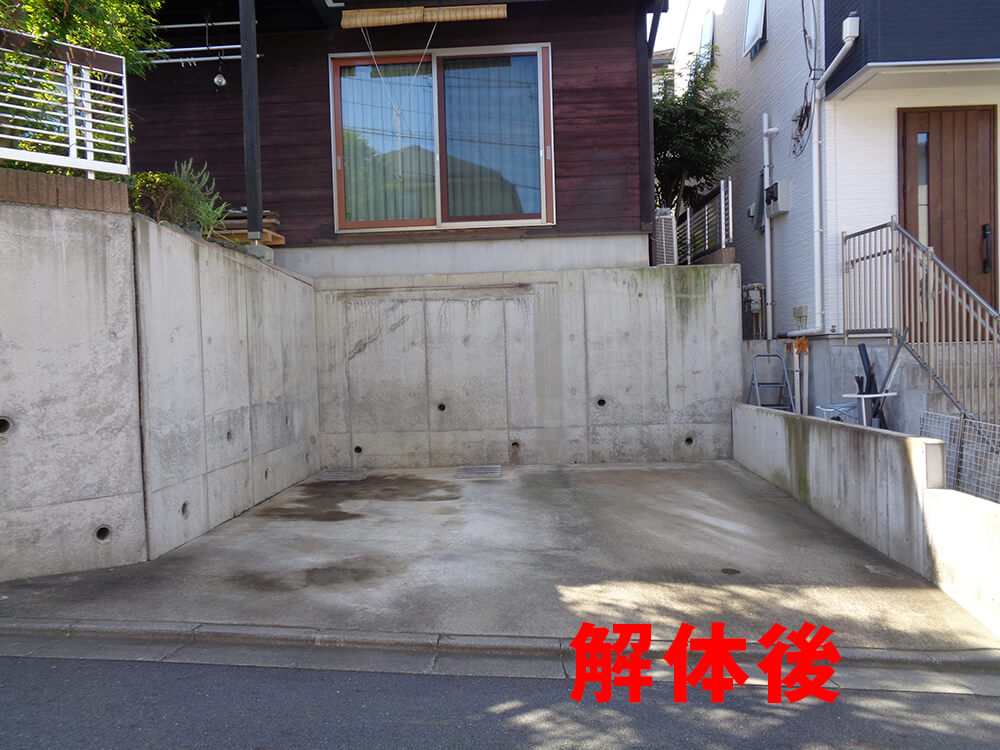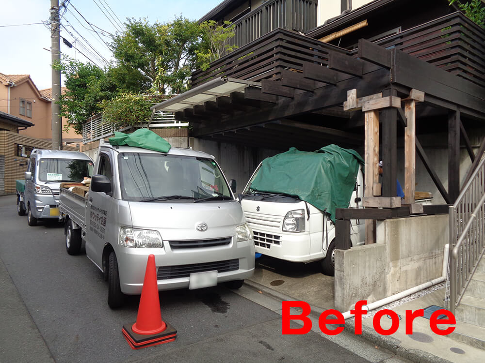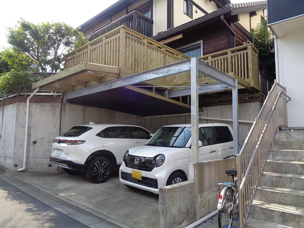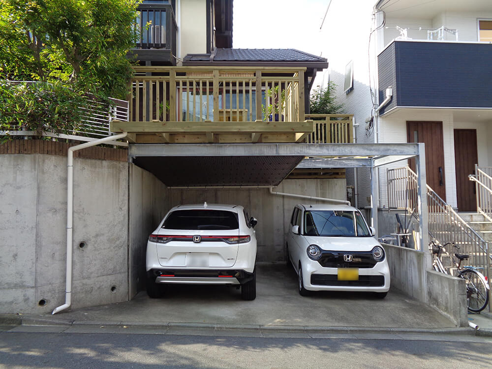- 造り替えデッキでは鉄骨架台を使用し、車2台の出し入れもスムーズ。