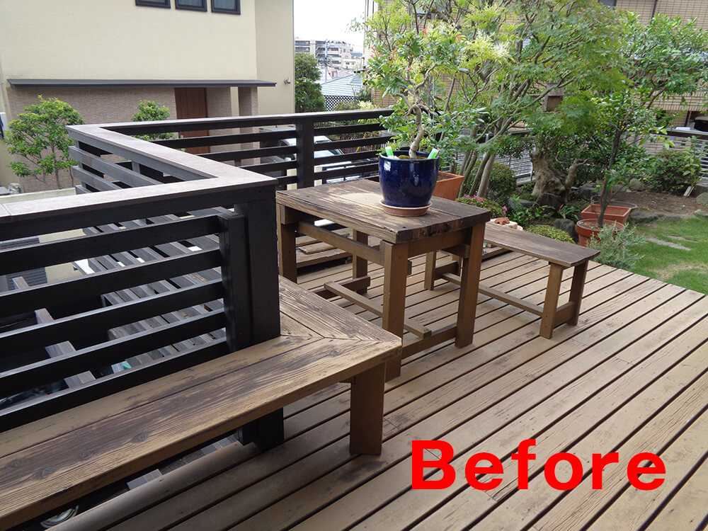 住宅の大工さんに作っていただいたウッドデッキ。塗装されていましたが防腐処理をしていない木材が使用されており、経年で梁が腐食してしまっている状況でした。床やフェンスはまだ使えましたが、このままでは危ないなめ造り替えのご依頼をいただきました。
