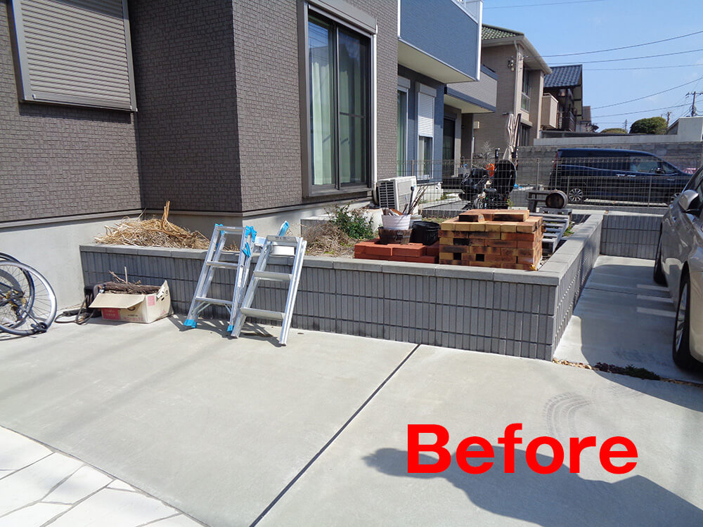 お庭のお手入れが行き届かず、ウッドデッキで使える・楽しめるお庭にしたい、フェンスで目隠しになるようにしたいとご希望です。