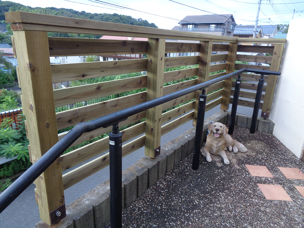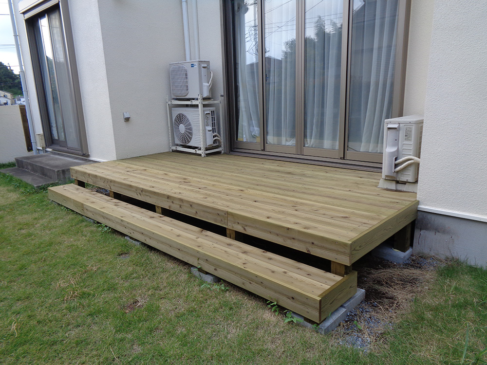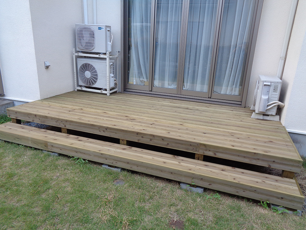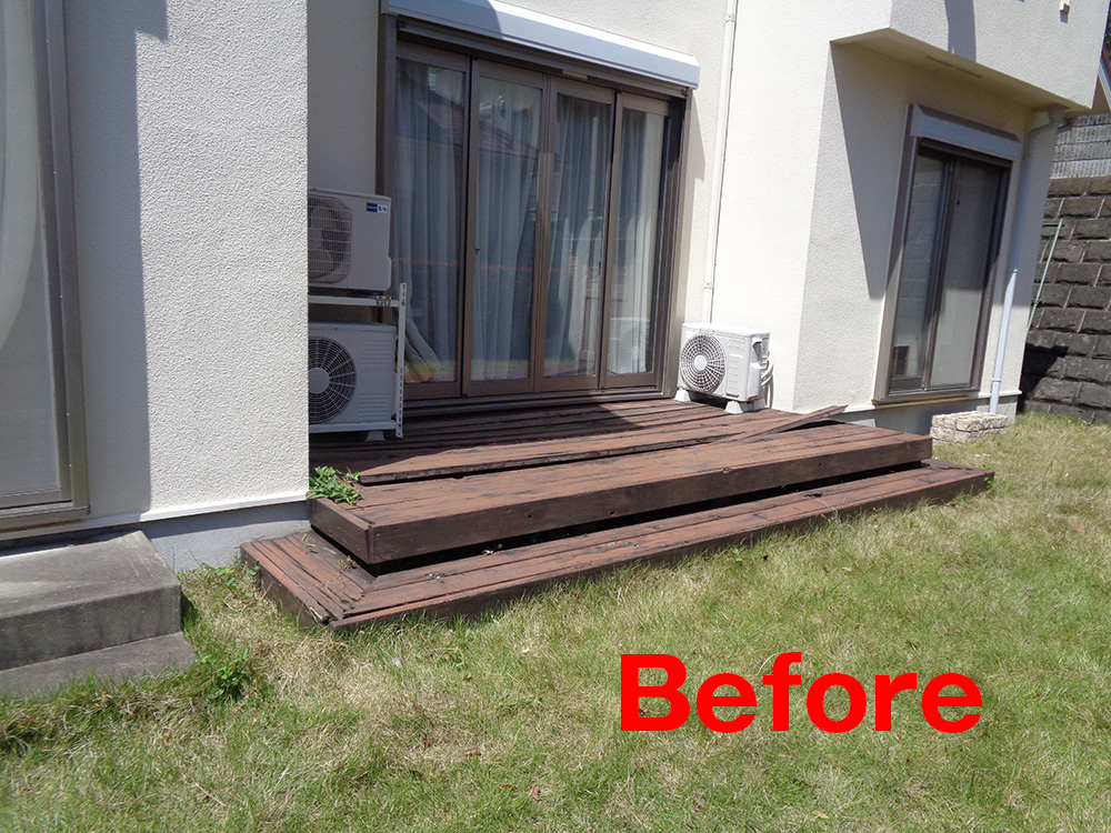 - 老朽化し床板も外れてしまったデッキを新しく造り替え。今までと大きさはそのままに、ステップをコの字から正面のみのロングステップへ変更。